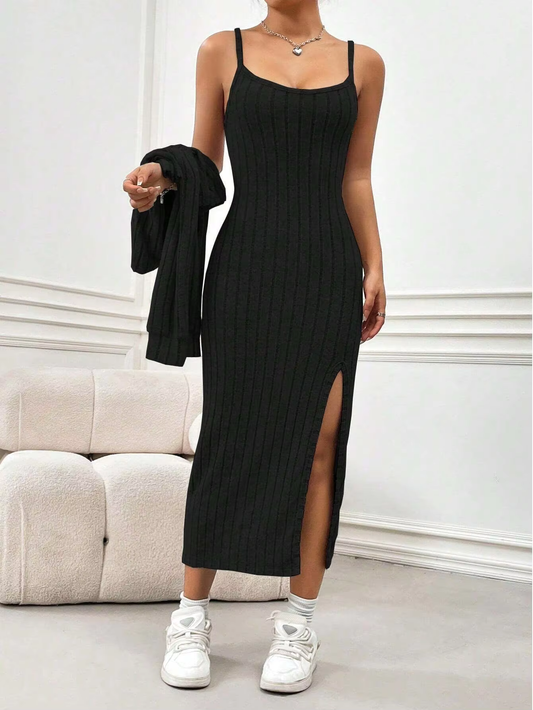 VALESKA™ Dress Set | Knitted Slit Maxi Dress & Cardigan Set